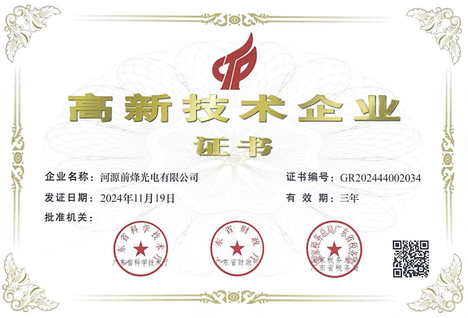 热烈祝贺河源前烽光电有限公司荣获高新技术企业称号,这是对团队卓越创新和高质量服务的认可,值得骄傲和庆祝。